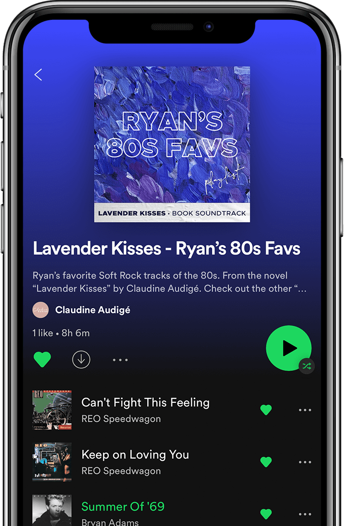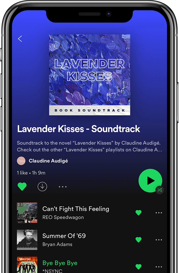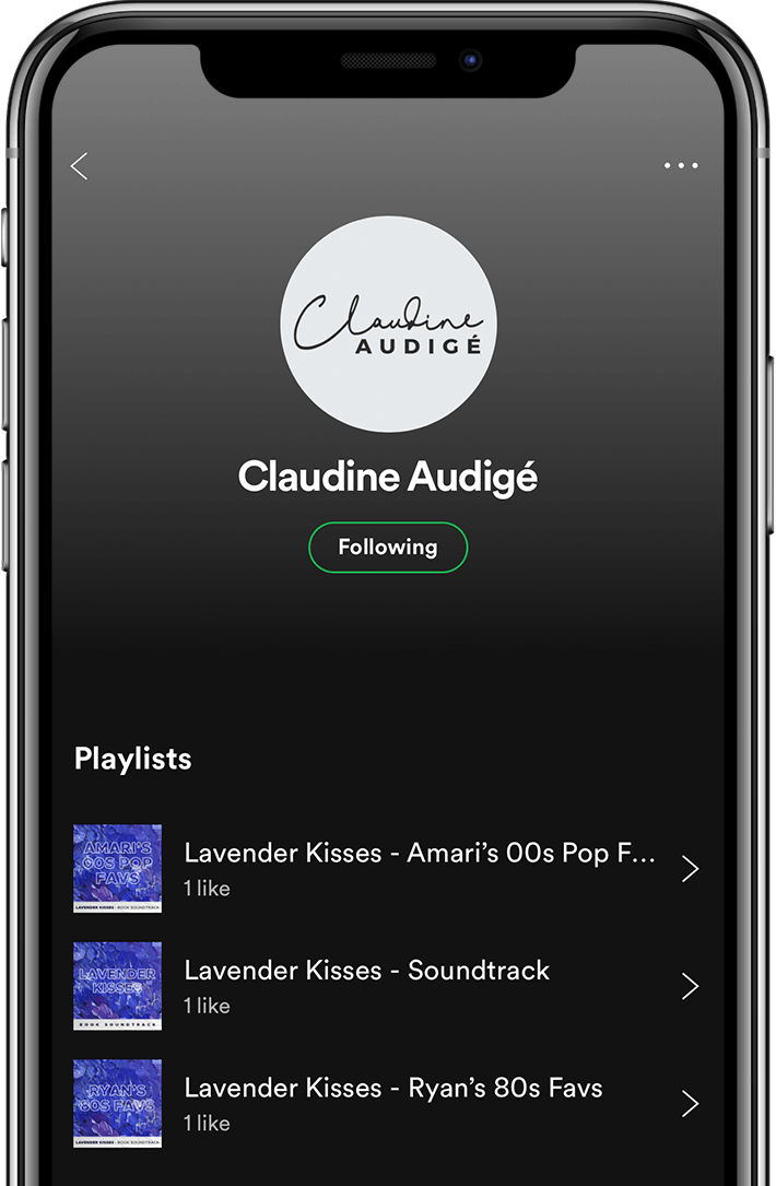 Don’t you love the feeling you get when a song plunges you back into a pool of (bitter) sweet memories? Claudine Audigé’s Spotify page offers curated playlists to accompany your reading journey. Play each song in the “Lavender Kisses” soundtrack as it appears in the book for an immersive experience. Get a deeper sense of the characters by discovering the songs they love.